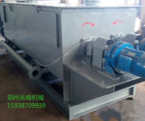 上述的混合是物理混合過(guò)程,即通過(guò)外力將兩種粉體顆粒均勻的混合在一起,并且要連續(xù)輸送出去,目前可選的設(shè)備有:1)機(jī)械式混料機(jī),其工作原理是進(jìn)入設(shè)備的兩種或以上物料通過(guò)水平主軸帶動(dòng)高速運(yùn)轉(zhuǎn)的攪拌葉片達(dá)到混合的目的,同時(shí)通過(guò)帶有傾角的葉片旋轉(zhuǎn)產(chǎn)生的推力將混合料從設(shè)備中排出,其混合效果,取決于攪拌的次數(shù),即葉片的轉(zhuǎn)速及設(shè)備的長(zhǎng)度;2)氣力與機(jī)械復(fù)合式混料機(jī),其工作原理是進(jìn)入設(shè)備的兩種或以上物料通過(guò)設(shè)備底層濾布下充氣的作用達(dá)到流態(tài)化,以達(dá)到混合的目的,同時(shí)通過(guò)水平低速運(yùn)轉(zhuǎn)的主軸帶動(dòng)葉片攪動(dòng)物料使其活化、均衡,減少顆粒受重力產(chǎn)生的分層離析現(xiàn)象,設(shè)備內(nèi)物料的輸送是靠進(jìn)出口的壓差使物料向出口方向流動(dòng),通過(guò)溢流方式排出,保證設(shè)備內(nèi)存料量,即保證了物料混合時(shí)間,以達(dá)到混合效果。這種物料輸送方式?jīng)Q定了金屬等高比重顆粒會(huì)沉積在設(shè)備底部,必須及時(shí)清理,但對(duì)水泥品質(zhì),及后續(xù)流程是有利的。在動(dòng)力方面由于兩者工作介質(zhì)狀態(tài)不同,使得后者在同比條件下動(dòng)力消耗僅為前者的10~20%,因此后者的自重及安裝要求都要小得多。
